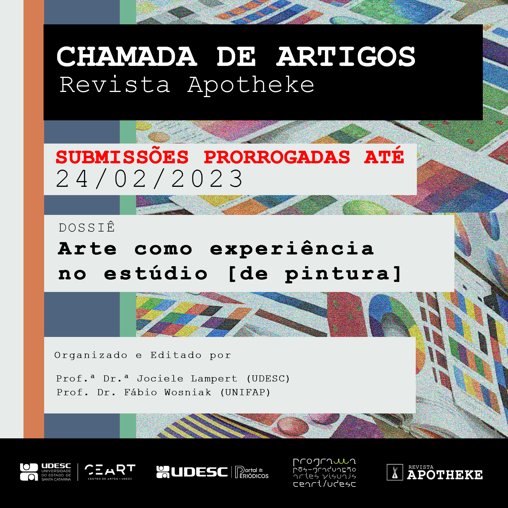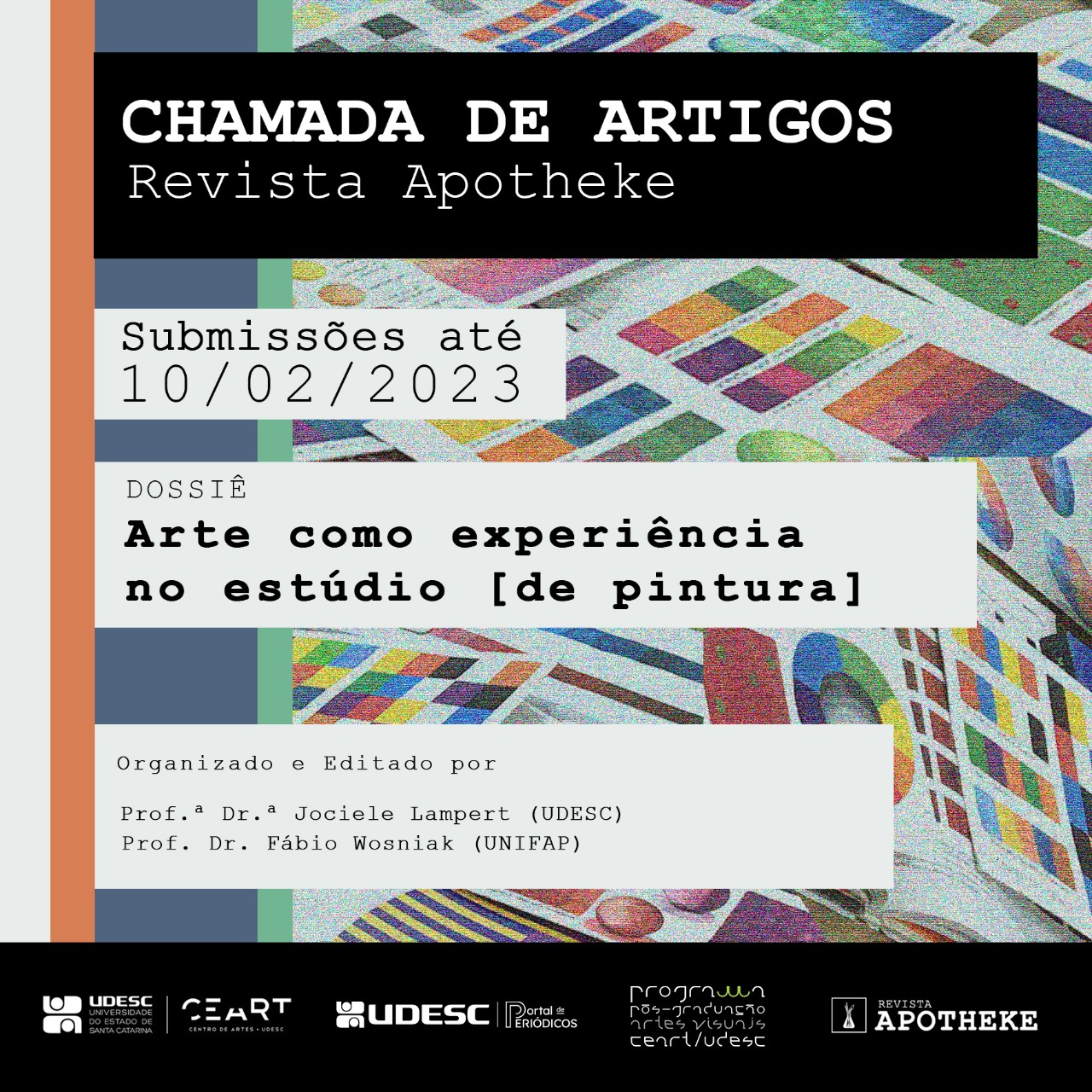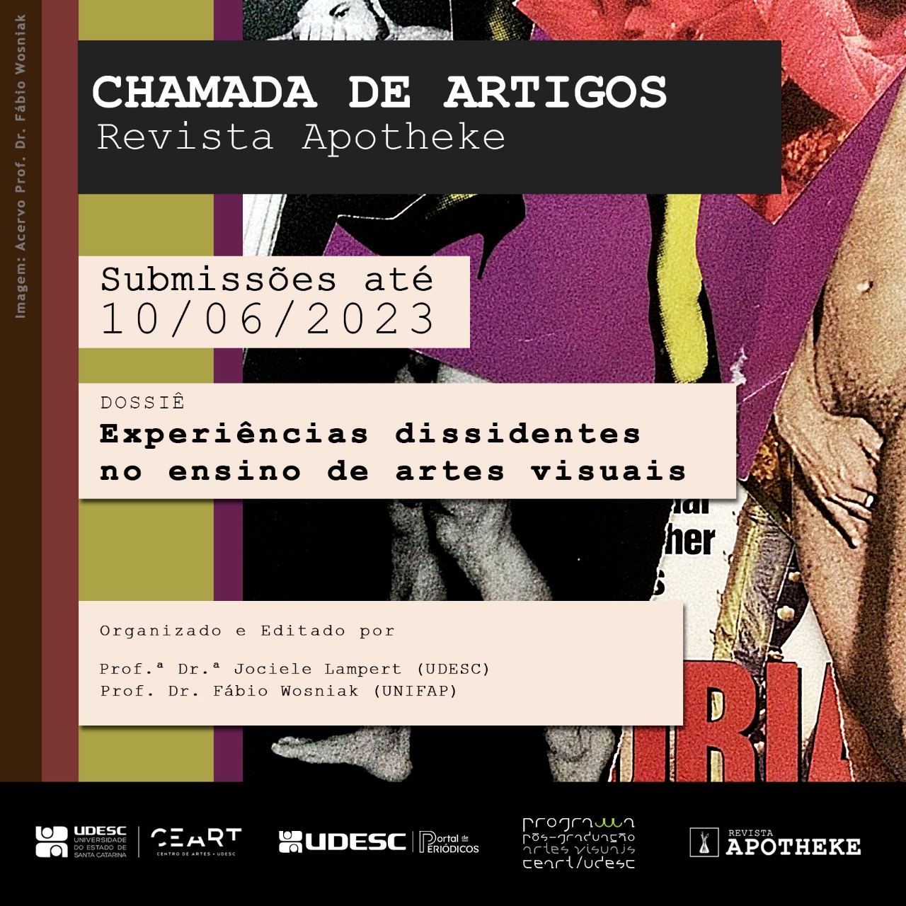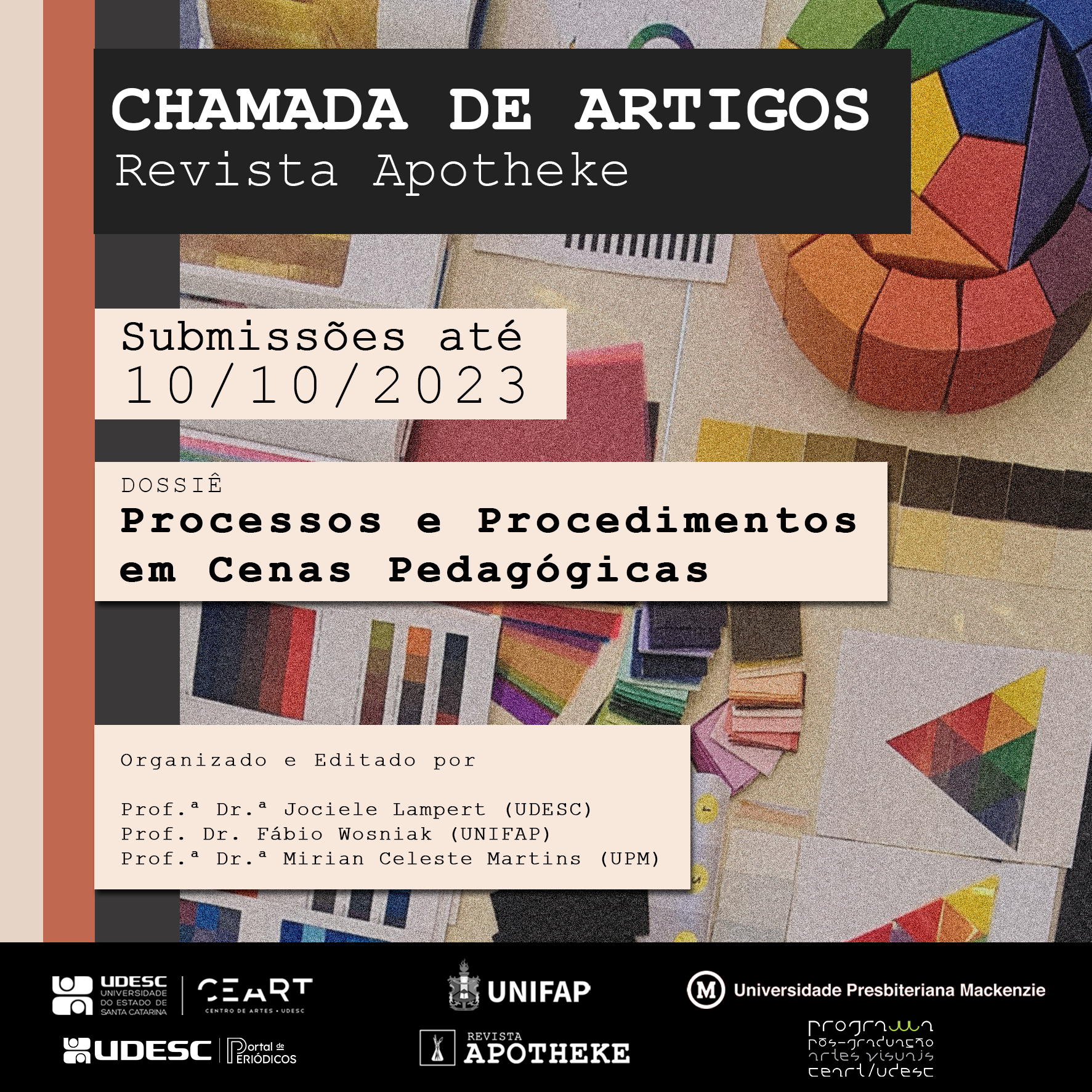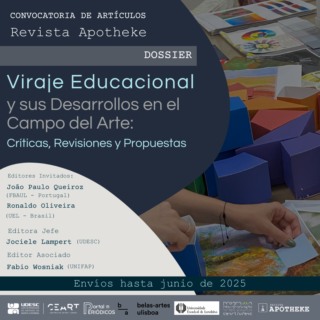 10-01-2024A Revista Apotheke convida professores/as, artistas, pesquisadores/as, acadêmicos/as e profissionais dedicados às artes visuais para se engajarem ativamente na elaboração dos três volumes que comporão o ano de 2024. Durante este período, nossa revista se empenhará em uma investigação minuciosa do tema central "Entre abordagens, métodos e metodologias", buscando dialogar sobre as múltiplas facetas que permeiam o vasto campo das Artes Visuais em articulação com a Arte/Educação.