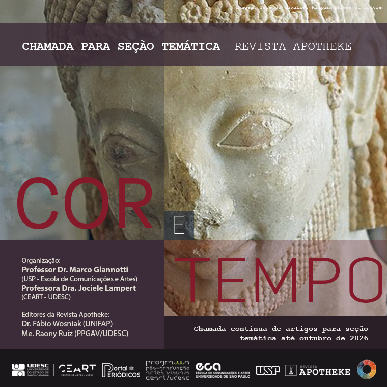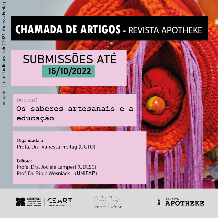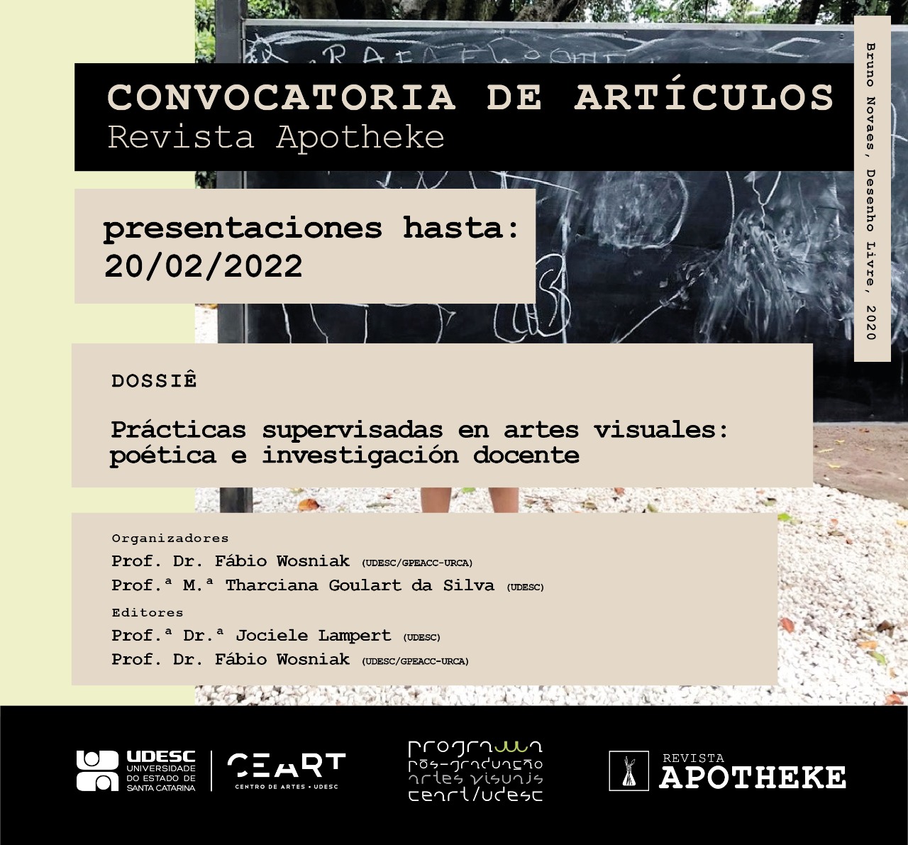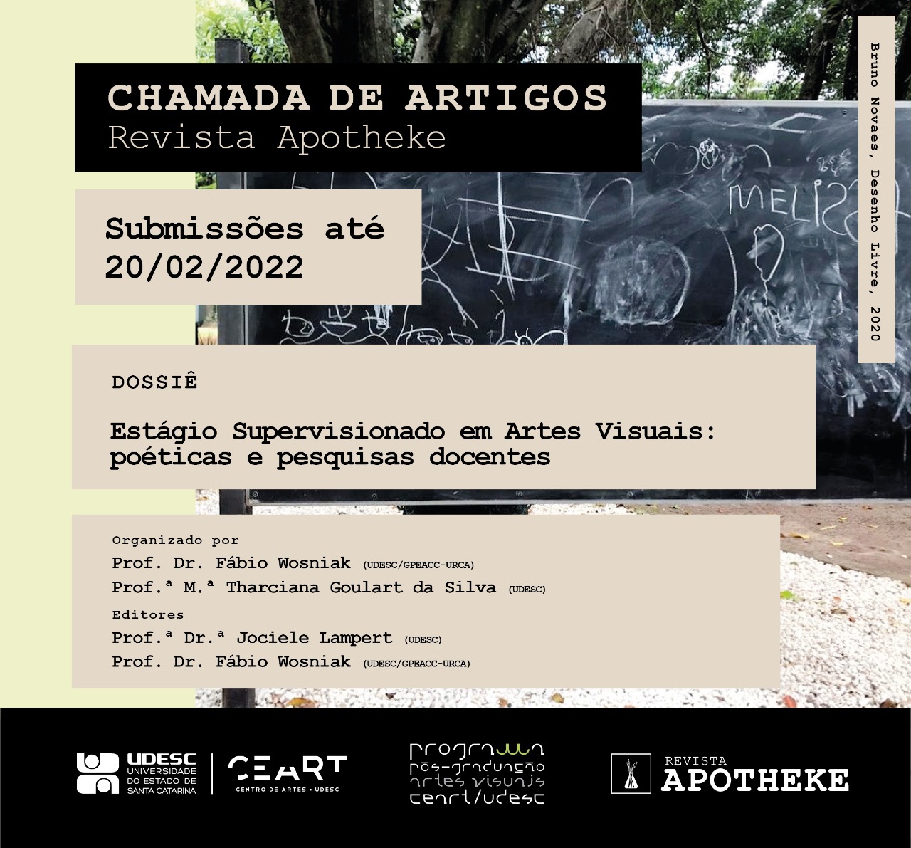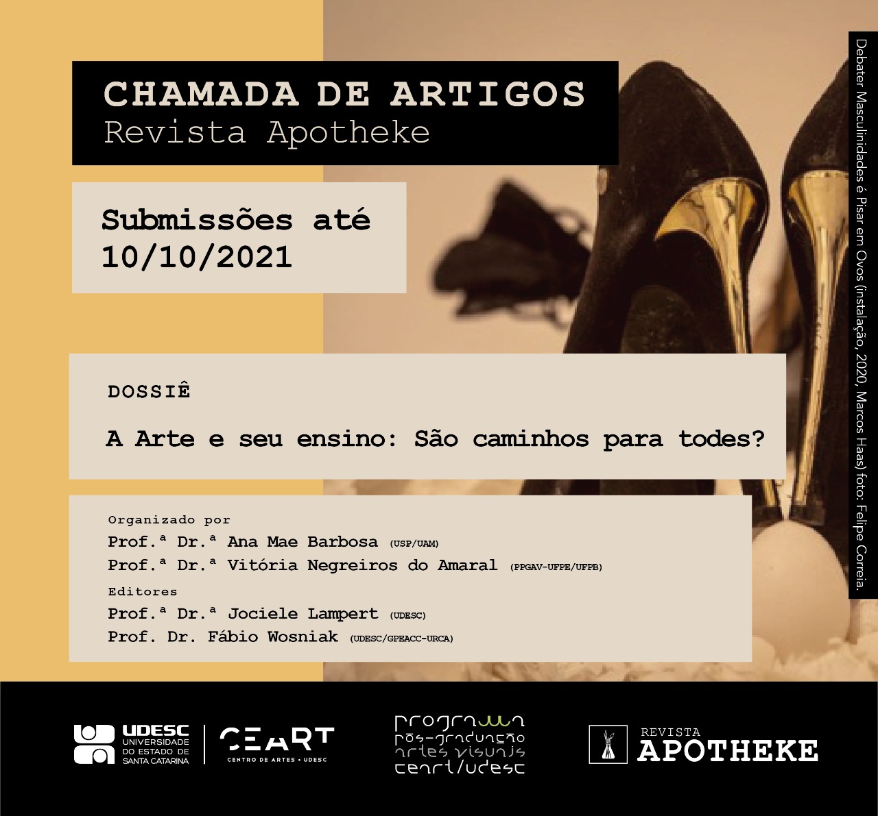 10-01-2024A Revista Apotheke convida professores/as, artistas, pesquisadores/as, acadêmicos/as e profissionais dedicados às artes visuais para se engajarem ativamente na elaboração dos três volumes que comporão o ano de 2024. Durante este período, nossa revista se empenhará em uma investigação minuciosa do tema central "Entre abordagens, métodos e metodologias", buscando dialogar sobre as múltiplas facetas que permeiam o vasto campo das Artes Visuais em articulação com a Arte/Educação.
