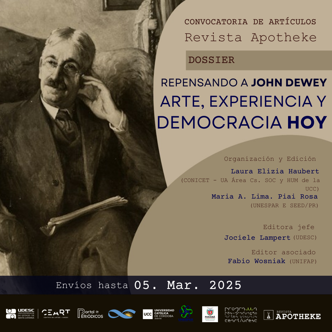 08-12-2020A Revista Apotheke, abordará neste dossiê articulações entre Educação, Artes Visuais e Experiência, considerando as contribuições do filósofo norte-americano John Dewey (1859-1952) para o campo das Artes, da Educação e da Arte Educação, compreendendo o ensino das artes visuais, assim como, artes cênicas e música. A teoria deweyana apresentou e, continua apresentando um novo projeto filosófico para pensar as condições e os valores sociais que envolvem uma ideia de conhecimento próximo às experimentações cotidianas da vida, onde mente e corpo, vida, arte e educação não são compartimentos, mas fazem parte de uma unidade que compõe a vida. Dewey nos convoca a pensar acerca da união das coisas, teoria/prática, arte/vida, educação/vida. Seguindo este pressuposto, o percurso de ensinar e aprender, voltado a uma reflexão crítica, o desafio estaria em romper com a fronteira que distingue a vida das demais coisas, ou seja, recompor essa associação impulsionaria a potência criadora do aprender-da-experiência.