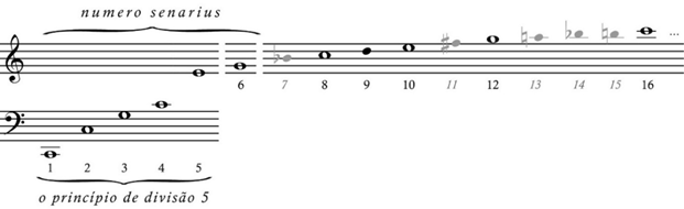 Com a considerável diferença realçada na Figura 2, observa-se que tal “princípio último de divisão” aproxima-se daquele limite que, na história da teoria musical, se conhece como o numero senario (senarius), a qual foi enaltecido por teóricos como Zarlino, Lippius e Rameau, que viram nesse espelho da natureza a expressão divina da ordem, do número e da perfeição.