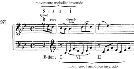 Figura 6 - Destaque para os movimentos invertidos nos compassos iniciais do Allegro da Sonata para piano em B@ maior, K. 333, nº 13 de Wolfgang Amadeus Mozart, 1783.