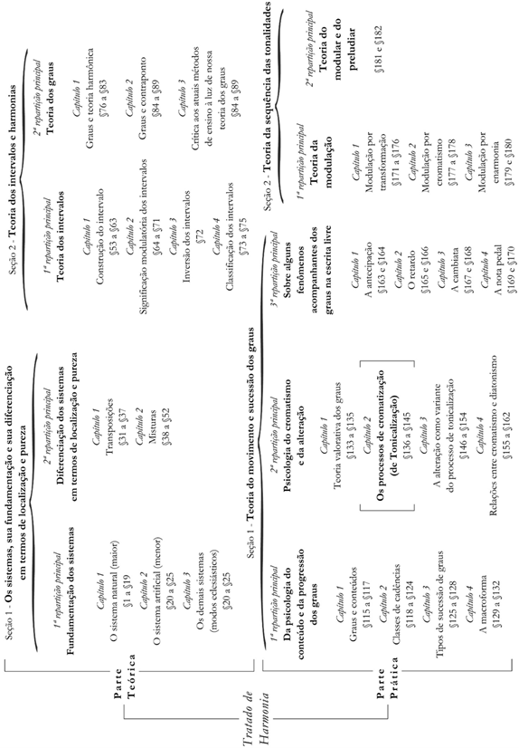 O Harmonielehre é considerado a primeira grande obra teórica de Schenker e sua mais extensa contribuição ao campo da harmonia. No volume, a ordenação dos conteúdos sugere uma lógica quase binária que, se observada sob determinado viés, pode chamar atenção para aspectos relacionados à oposição conceitual aqui em pauta. Como mostra a Figura 1, desconsiderando o prefácio, o sumário e o índice remissivo, o tratado (SCHENKER, 1906) está dividido em duas grandes partes: a teórica e a prática. Cada parte se subdivide em duas seções, as quais estão organizadas em duas ou três repartições principais que acomodam os capítulos. E os capítulos expõem os §1 a §182 em aproximadamente 460 páginas. Nessa figura, vale notar que a ordenação dos conteúdos – e com isso, em alguma medida, também o pensamento sobre tais conteúdos – segue uma espécie de