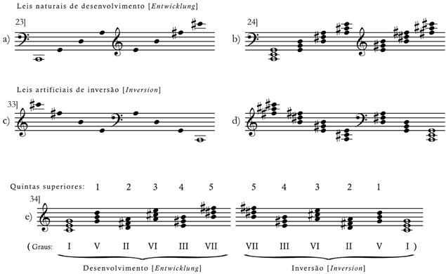 [§82] Os graus, de certo modo, são iguais àquelas quintas que já conhecemos no §16 como pilares básicos unificadores e notas fundamentais do sistema, e que, segundo os princípios de desenvolvimento e de inversão [Prinzipien der Entwicklung und der Inversion], se sucedem respectivamente para cima ou para baixo (SCHENKER, 1990, p. 224).[7]