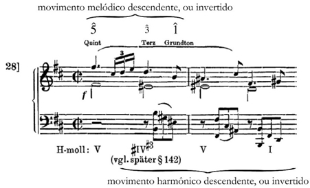Por considerar as “leis de desenvolvimento” – isto é, o fenômeno natural da quinta justa como o primeiro harmônico a se diferenciar acima do som fundamental e sua oitava – como algo que é “normal” [normaler Entwicklung][16] e, portanto, consabido ou mesmo irreversível, Schenker (1990, p. 78-85) passa a se ocupar do par opositor. Ou seja, passa a tratar das “leis artificiais de inversão” dedicando ao movimento descendente – aquele produzido pela mão do homem e não pela natureza – todo o §16 “A inversão como contrapartida ao desenvolvimento”, do Capítulo 1, da Seção 1. Sigamos as linhas gerais de sua argumentação: