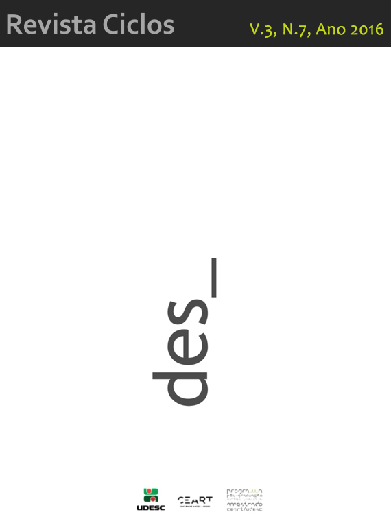 Nesta edição de número 7 da Revista Ciclos será possível contemplar a terceira parte dos artigos vinculados ao XI Ciclo de Investigações – des_, evento realizado em agosto de 2016 pelos discentes do PPGAV. Maiores informações sobre o evento podem ser encontradas no site: http://des-ciclo.tumblr.com/