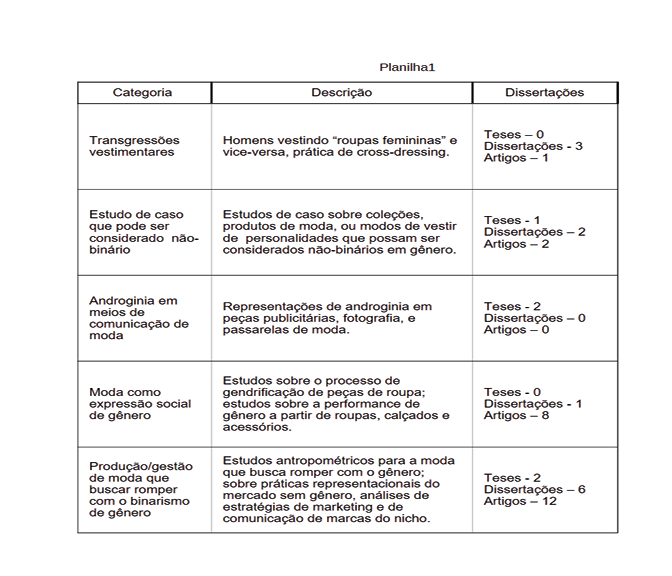 Ao realizar tal levantamento, foi possível categorizar os trabalhos acadêmicos desenvolvidos em 5 categorias (Tabela 1) que auxiliam na compreensão dos interesses de pesquisa demonstrados, até o momento no Brasil, por pesquisadores/as de tal campo. Percebemos, ainda, uma prevalência pelo interesse pela moda que busca romper com o binarismo de gênero como mercado de moda, pensando sua viabilidade técnica e coerência comunicacional.