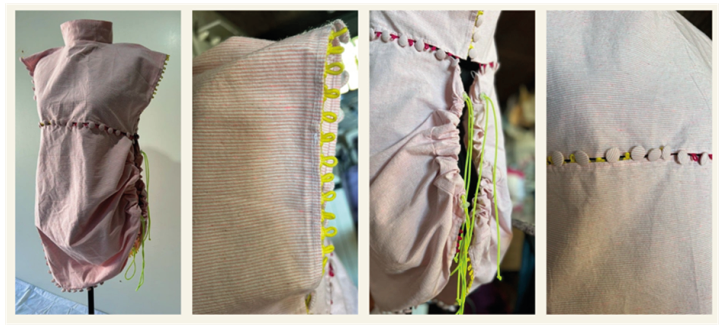 No entanto, uma análise crítica da etapa experimental também expõe os desafios inerentes ao projeto e às desconexões entre a teoria idealizada e a prática da execução modular. A aplicação dos zíperes, embora funcional para a modularidade, introduziu certa rigidez ao produto, o que pode influenciar questões ergonômicas e vestibilidade, interferindo na fluidez desejada em peças modulares, aspecto que Körbes (2015) já sinalizava como ponto de atenção e precisão técnica. Conforme mostra a Figura 4, o correto posicionamento e a adequada distribuição desses elementos de conexão nas peças são essenciais para preservar a integridade estrutural e o conforto do artefato.