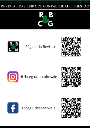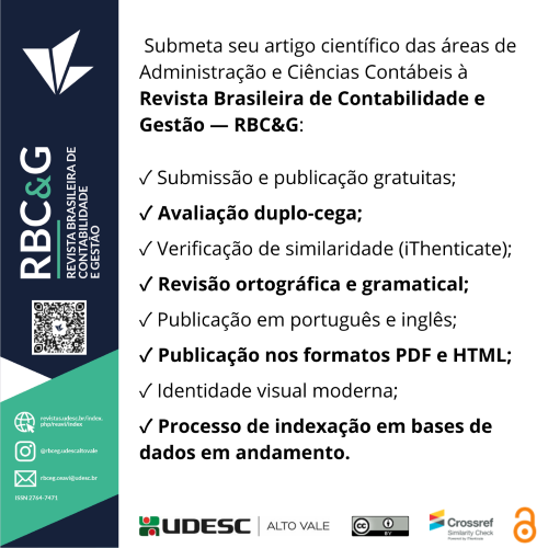 Prezado(a) leitor(a), autor(a), avaliador(a), editor(a),   No dia 23 de junho, publicamos a Edição v. 12 n. 22 (2023) da Revista Brasileira de Contabilidade e Gestão. Um detalhe importante é que os artigos dessa edição em especial foram publicados, além de em Língua Portuguesa e Língua Inglesa, também em Língua Espanhola. Gostaríamos de solicitar uma ampla divulgação de nossa revista entre seus pares, nas Universidades em que atuam, para que tornemos a RBC&G mais conhecida.   Divulguem também os trabalhos nas redes sociais. Divulguem a revista nas redes sociais. Saiba mais sobre Publicação - Edição v. 12 n. 22 (2023)